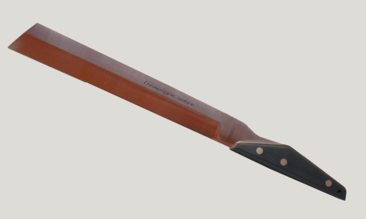 caratteristiche Il progetto Champagne Sabre ha ridisegnato in chiave moderna uno strumento utilizzando, oltre all'acciaio, materiali green: il manico è in materiale riciclabile . La zigrinatura tra manico e lama, migliora la presa e serve a rompere