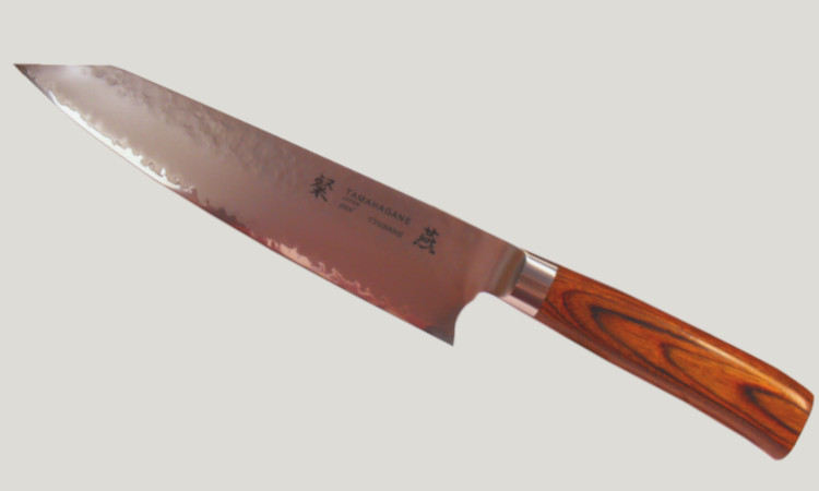 caratteristiche lama in acciaio inox SAN MAI tagliente in VG5 ad alto contenuto di Carbonio Durezza sul filo HRC 58/59 - Esternamente sono in acciaio inox SUS410 Martellato crea un effetto Antiaderente L'acciaio VG5 è molto resistente alle ossidazioni, ha una durezza elevatissima e quindi rende il tagliente del coltello davvero eccezionale Manico in Black Micarta un materiale ingegnerizzato ad alta pressione a base di Resine/Fibre. Un coltello da cucina giapponese professionale,un prodotto davvero eccezionale con materiali di prima scelta e un ottimo design. lama cm. 20